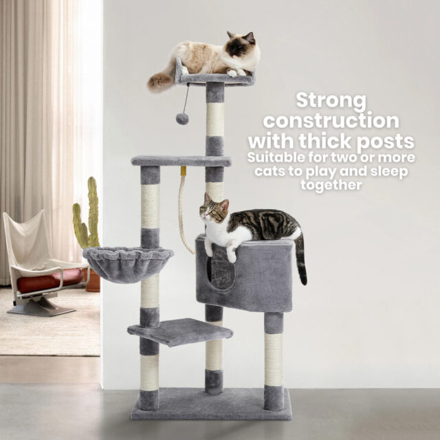 • Scratching Posts: Wrapped in sisal rope, these posts satisfy your cat’s scratching needs, protecting your furniture from damage.