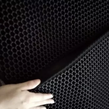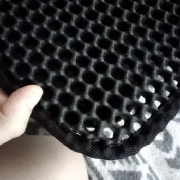 Decided on this item as had the same features as the slightly more expensive versions and the cheeper ones didnt look like they would work for me. The cats are happy with it and the honeycomb structure catches the wood pellets as I was hoping. The top layer is made from an eva type material so it's quite soft and spongy Really easy to clean I spray with bathroom cleaner and shower it all off in the bath when needed. My bathroom floor stays so much cleaner now the wood dust and pellets stay mostly contained in the mat. I think that if I was using fine grained clay or corn litter it would be even more efficient (I knew that the pellets.wpuld be a bit big for the design but it makes a big difference) I would reccomend this without hesitation :)