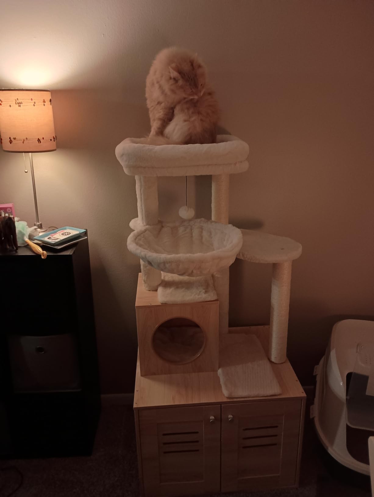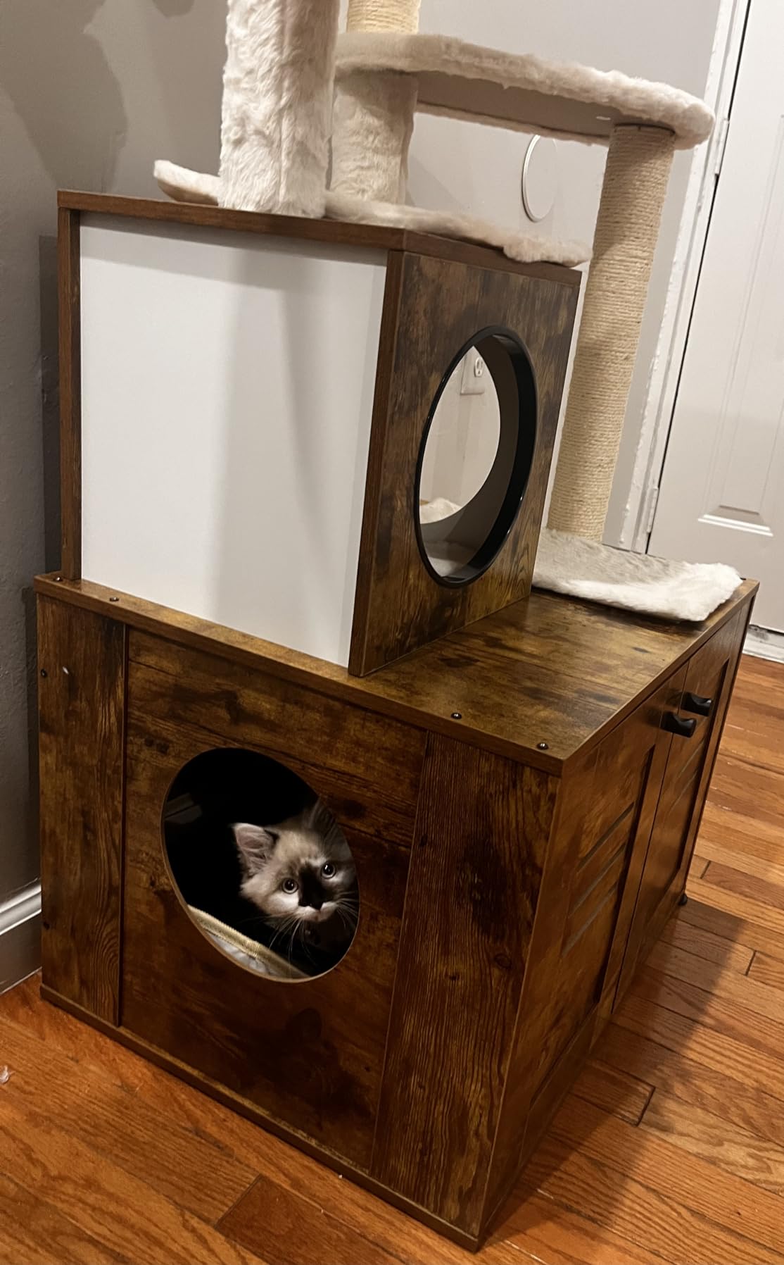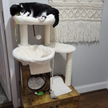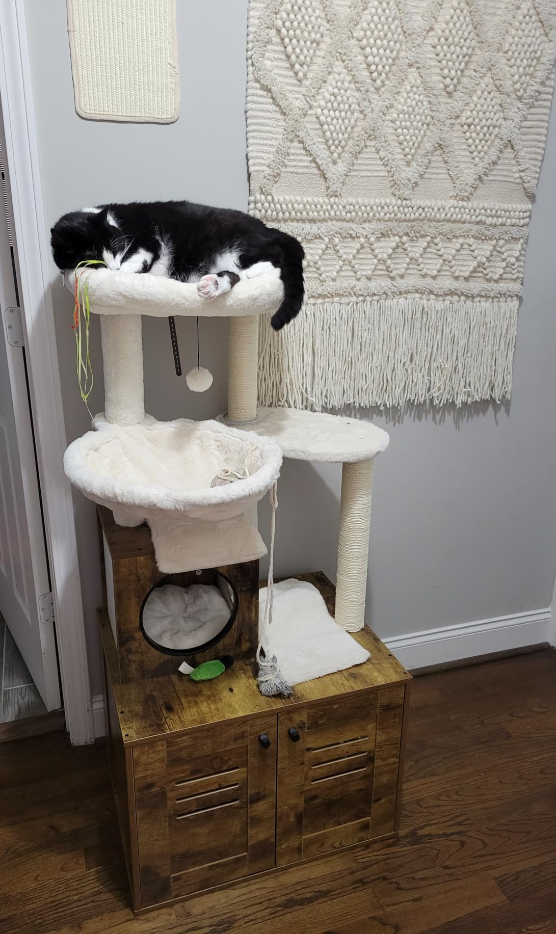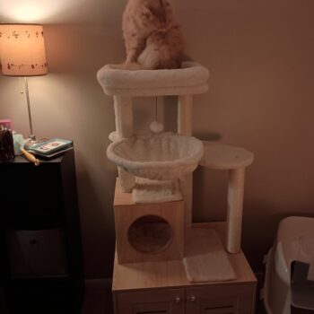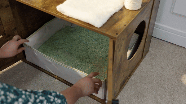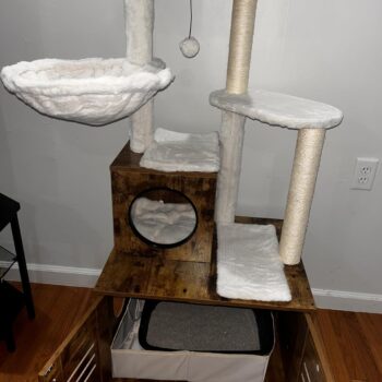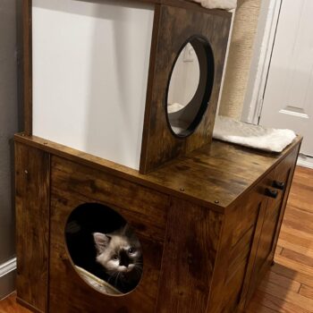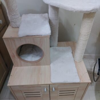 • Features a large, spacious cabinet that can double as a cozy sleeping area or house a litter box.