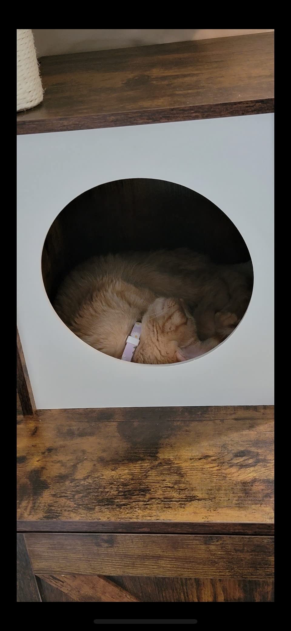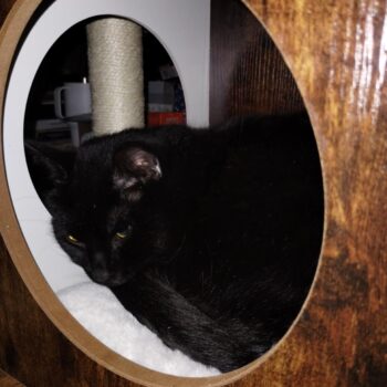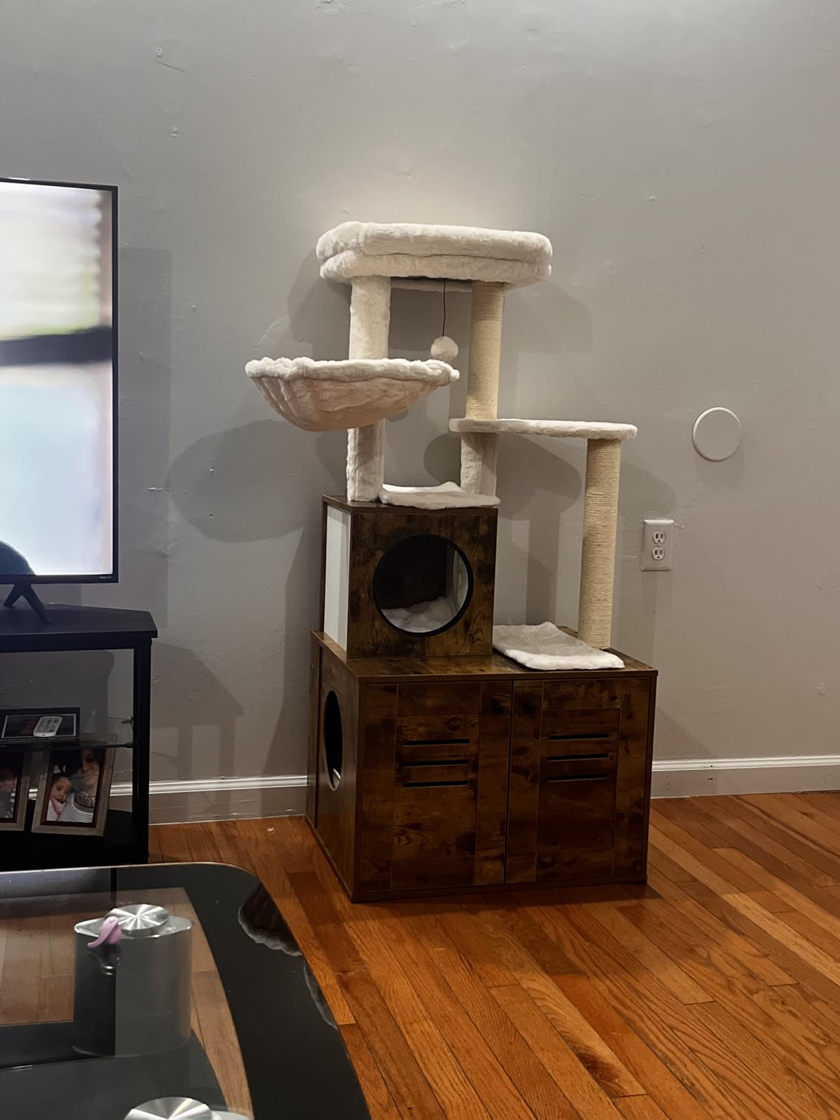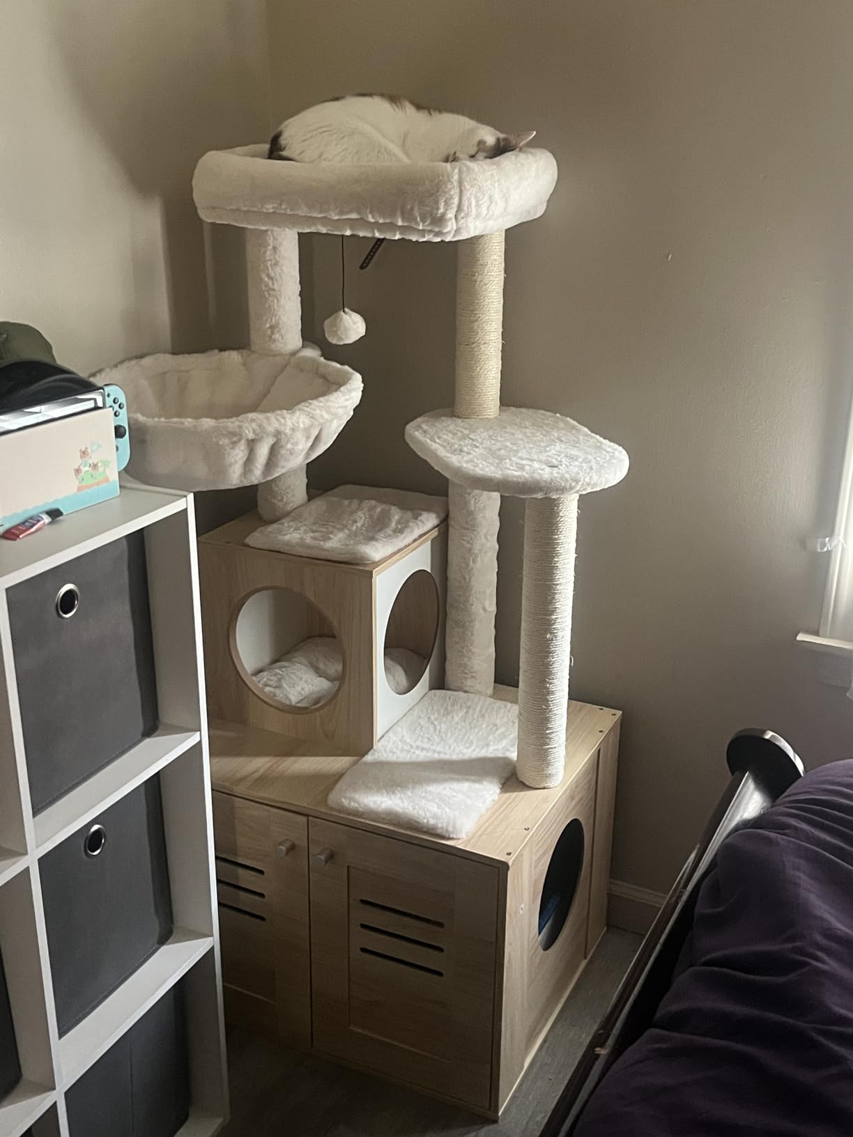 • Features a large, spacious cabinet that can double as a cozy sleeping area or house a litter box.