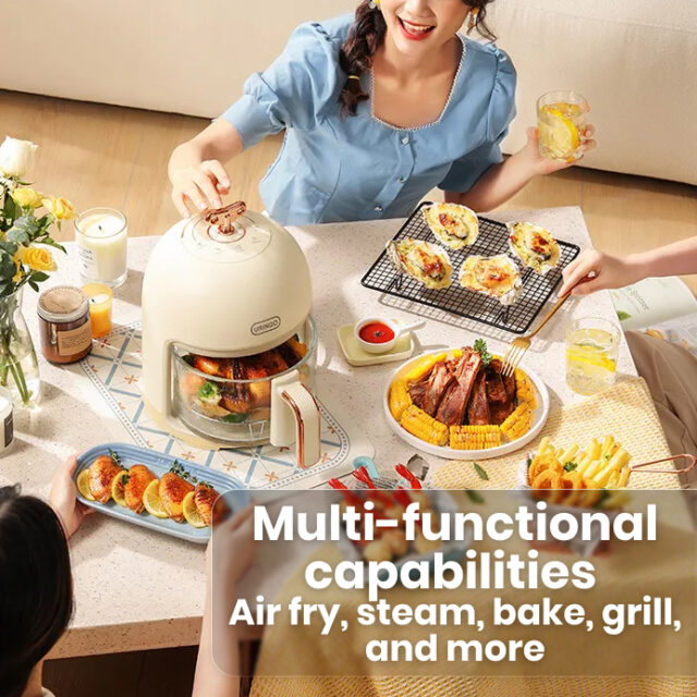 What sets our air fryer apart is its transparent glass design combined with its multi-functional capabilities. This unique combination ensures not only healthier cooking but also a user-friendly experience that fits perfectly into your lifestyle. With its sleek design, it’s not just an appliance but a kitchen showpiece.